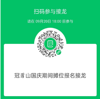 三、摊位名额与报名规则摊位名额:共计 30个摊位报名方式:通过指定小程序进行接龙报名,报名结束后,进行统一摇号以最终确认摊位。(请扫码参与报名接龙)