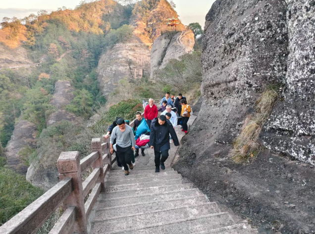 冠豸山顶为主峰灵芝峰与五老峰。灵芝峰相对高度为660.8米,是冠豸山最高主峰,形似一朵千年灵芝,故有此名。其西南向为五老峰,登崎岖险道,上峰顶平坦开阔,可容数百人。伫立峰顶,往西眺望,城郭隐约,村落点点,千顷平畴,绿浪起伏。往东放眼,层峦叠嶂,如海浪涌来。五老峰与灵芝峰之间有一天然裂隙,游人到此,翘首青天一线,两壁夹立,峭拔千仞,直接霄汉,称“一线天”。一线天口有方井“金字泉”,其水清甜,为煮茶上品。自一线天向东行,经蚁蚣路,可达“寿星峦”,此峦活脱一个头颅浑圆,弯腰行进的老人。扶栏而上,峦顶有长寿亭。亭之南面峭壁上有罗丹的“人长寿”巨幅摩崖石刻,峦、亭、字互为烘衬。从寿星峦下奇险天梯,穿过浓荫蔽日的山谷,眼前突现一冲天石柱,相对高度54.1米,巍然挺立于深谷,古人称“照天烛”。因颇具阳刚之气,现人称“生命之根”。与照天烛毗邻,数块形态各异、体积巨大的崩塌岩石互相堆叠架构,形成内部秀石林立、幽深且阔卓的洞穴,称“莲花洞”。内有古桌石凳,清泉自岩壁石隙涌出,潺潺流入一池。炎夏凉风习习,寒冬温暖如春。出莲花洞口,可见五块与山体相连的岩石,称“五姐妹石”。灵芝峰侧有一处由崩塌岩石叠垒而成呈三角形约10平方米的岩洞,名“雪洞”,这里凉风习习,十分清爽,岩壁上白斑点点,像飘洒的雪花。