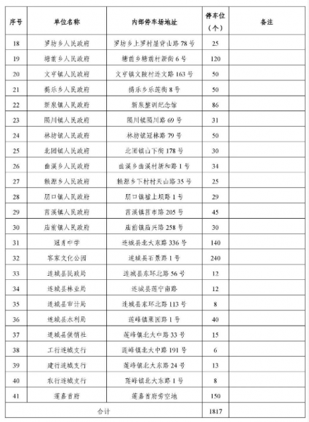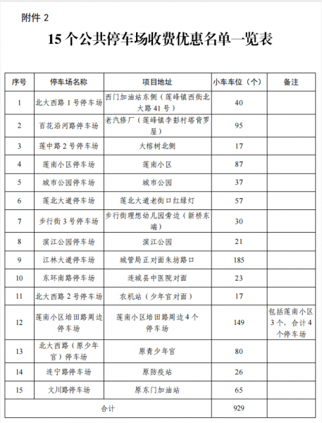 为全面落实文旅惠民举措,营造良好的文旅服务软环境,进一步缓解游客假期停车难问题,经研究决定,国家法定节假日期间对我县城区范围内及景区所属乡(镇)具备条件的机关和国有企事业单位内部停车场实行免费向公众开放,15个公共停车场实行停车费4折优惠政策。现将有关具体事项通知如下: 一、开放单位 全县具备开放条件的机关事业单位(学校、医院、公安、检察、法院机关除外),41个。详见《附件1:机关企事业单位内部停车场对外开放名单一览表》。 二、收费优惠停车场 连城县弘源投资管理有限公司15个公共停车场2025年国家法定节假日期间,实施优惠收费活动(按原收费标准4折优惠),具体措施如下:1小时以内(含1小时)免费,超过1小时-2小时(含2小时)由原5元标准优惠调整至2元;超过2小时后每小时1元(不足1小时按1小时计算),24小时内封顶由原15元标准优惠调整为6元,24小时以上重新按停放时间循环计费。已享受月卡、年卡优惠的车辆不再享受该优惠方案;享受次卡优惠的车辆在停车场内若有其他收费,也享受封顶6元优惠。详见《附件2:15个公共停车场收费优惠名单一览表》 三、开放时间 2025年国家法定节假日期间