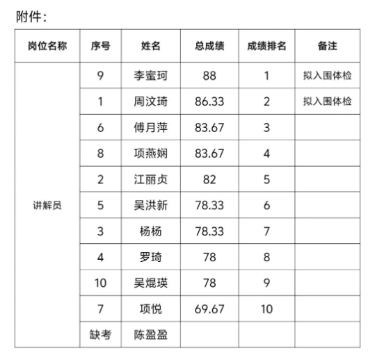 根据《连城县冠豸山旅游发展有限公司关于公开招聘景区讲解员的公告》要求,连城县冠豸山旅游发展有限公司于2025年10月22日组织了景区讲解员面试,现将面试成绩予以公示。公示时间:2025年10月23日-10月27日,公示期间,如有异议,请向连城县纪委监委驻县人民政府办公室纪检监察组反馈,监督电话:0597-8921895。 附件:连城县冠豸山旅游发展有限公司招聘景讲解员面试成绩公示表 连城县冠豸山旅游发展有限公司 2025年10月23日 来源:冠豸山景区微信公众号