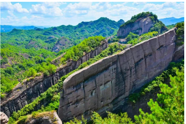 冠豸山顶为主峰灵芝峰与五老峰。灵芝峰相对高度为660.8米,是冠豸山最高主峰,形似一朵千年灵芝,故有此名。其西南向为五老峰,登崎岖险道,上峰顶平坦开阔,可容数百人。伫立峰顶,往西眺望,城郭隐约,村落点点,千顷平畴,绿浪起伏。往东放眼,层峦叠嶂,如海浪涌来。五老峰与灵芝峰之间有一天然裂隙,游人到此,翘首青天一线,两壁夹立,峭拔千仞,直接霄汉,称“一线天”。一线天口有方井“金字泉”,其水清甜,为煮茶上品。自一线天向东行,经蚁蚣路,可达“寿星峦”,此峦活脱一个头颅浑圆,弯腰行进的老人。扶栏而上,峦顶有长寿亭。亭之南面峭壁上有罗丹的“人长寿”巨幅摩崖石刻,峦、亭、字互为烘衬。从寿星峦下奇险天梯,穿过浓荫蔽日的山谷,眼前突现一冲天石柱,相对高度54.1米,巍然挺立于深谷,古人称“照天烛”。因颇具阳刚之气,现人称“生命之根”。与照天烛毗邻,数块形态各异、体积巨大的崩塌岩石互相堆叠架构,形成内部秀石林立、幽深且阔卓的洞穴,称“莲花洞”。内有古桌石凳,清泉自岩壁石隙涌出,潺潺流入一池。炎夏凉风习习,寒冬温暖如春。出莲花洞口,可见五块与山体相连的岩石,称“五姐妹石”。灵芝峰侧有一处由崩塌岩石叠垒而成呈三角形约10平方米的岩洞,名“雪洞”,这里凉风习习,十分清爽,岩壁上白斑点点,像飘洒的雪花。