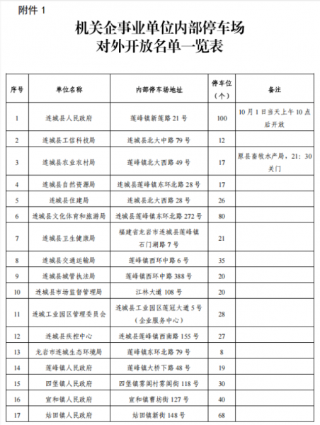 为全面落实文旅惠民举措,营造良好的文旅服务软环境,进一步缓解游客假期停车难问题,经研究决定,国家法定节假日期间对我县城区范围内及景区所属乡(镇)具备条件的机关和国有企事业单位内部停车场实行免费向公众开放,15个公共停车场实行停车费4折优惠政策。现将有关具体事项通知如下: 一、开放单位 全县具备开放条件的机关事业单位(学校、医院、公安、检察、法院机关除外),41个。详见《附件1:机关企事业单位内部停车场对外开放名单一览表》。 二、收费优惠停车场 连城县弘源投资管理有限公司15个公共停车场2025年国家法定节假日期间,实施优惠收费活动(按原收费标准4折优惠),具体措施如下:1小时以内(含1小时)免费,超过1小时-2小时(含2小时)由原5元标准优惠调整至2元;超过2小时后每小时1元(不足1小时按1小时计算),24小时内封顶由原15元标准优惠调整为6元,24小时以上重新按停放时间循环计费。已享受月卡、年卡优惠的车辆不再享受该优惠方案;享受次卡优惠的车辆在停车场内若有其他收费,也享受封顶6元优惠。详见《附件2:15个公共停车场收费优惠名单一览表》 三、开放时间 2025年国家法定节假日期间
