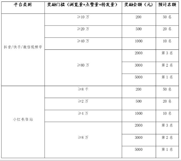 2.超级爆款奖(取平台数据最高者):抖音/快手/微信视频号:单条作品总互动量达200万以上的最高者(播放量+点赞量+转发量)奖励8888元。小红书/B站:单条作品总互动量达到20万以上的最高者(浏览量+点赞量+转发量)奖励5888元。