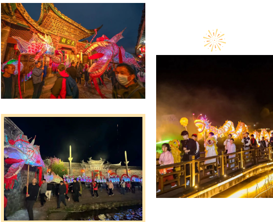 日游古村,寻觅悠闲漫步千米古街,自由探访“九厅十八井”格局的经典古民居,感受古代建筑的巧妙与家族生活的智慧。参观农耕文化展示区,了解传统农具。在鸡公坪,可随时参与投壶、猜客家灯谜等传统游艺,赢取民宿折扣券或特产代金券,享受慢节奏的假日乐趣。向下滑动查看夜赏八景、如梦似幻入夜,灯笼点亮千米古街,“古墙夜话”“十番古戏”等场景依次呈现,感受古村不同于白日的静谧与浪漫。年初三晚上,由村民自编自导自演的 “培田小春晚” 将在古戏台压轴登场,节目源于生活,充满乡土气息与真挚情感,不容错过。